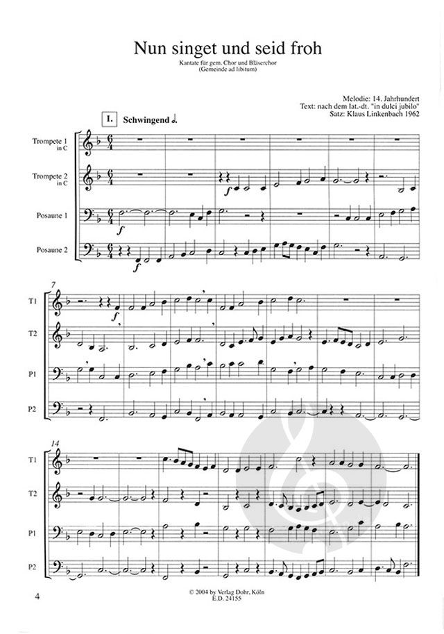 Gemischter Chor (4-st.), Gemeinde, Trompete (2), Posaune (2), Orgel; Partitur. Format: 19 S. - 29,7 x 21 cm.