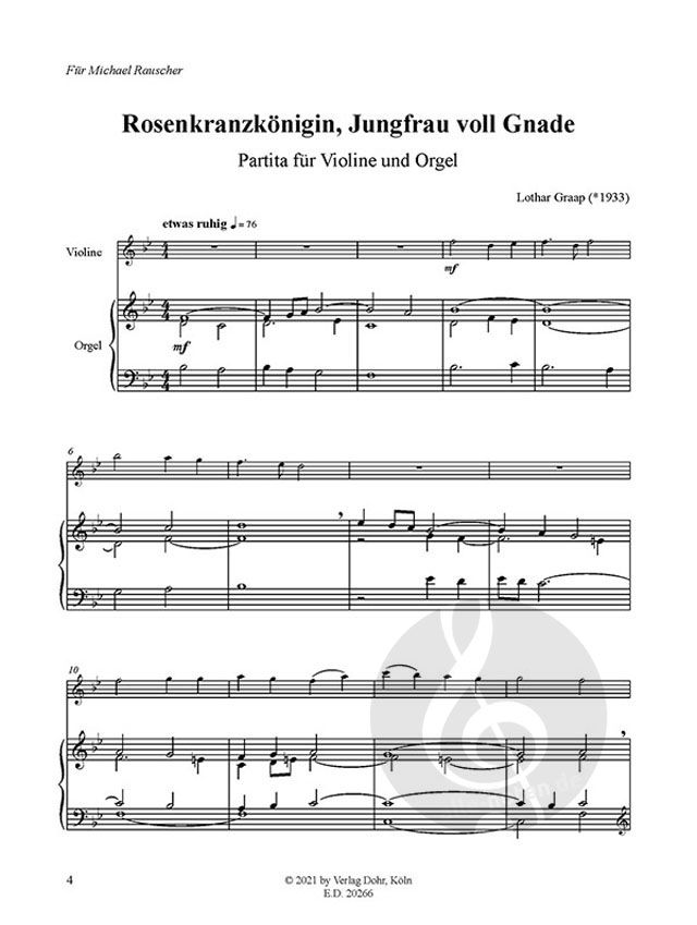 In katholischen Kirchengemeinden in Süddeutschland ist das Lied 'Rosenkranzkönigin, Jungfrau voll Gnade' besonders bekannt und beliebt. Hier ist die Melodie dieses Kirchenliedes für Violine und Orgel...