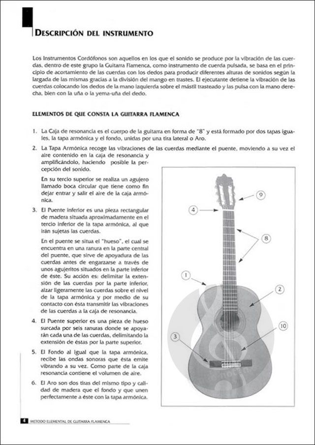 Ein Werk, das das formale Studium der Flamencogitarre fördern soll. Allmähliche und progressive Einführung in die Technik der beiden Hände. Enthält Übungen, Studien und Duette. span.