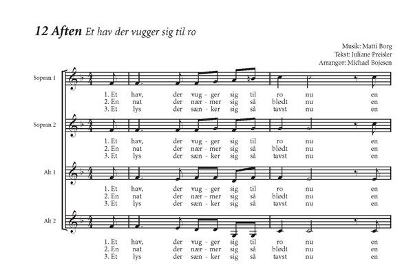Matti Borgs AFTEN (Et hav der vugger sig til ro) arrangeret for lige stemmer SSAA af Michael Bojesen. Tekst af Juliane Preisler. Saertryk fra '13 Nye Hojskolesange' (WH30707).