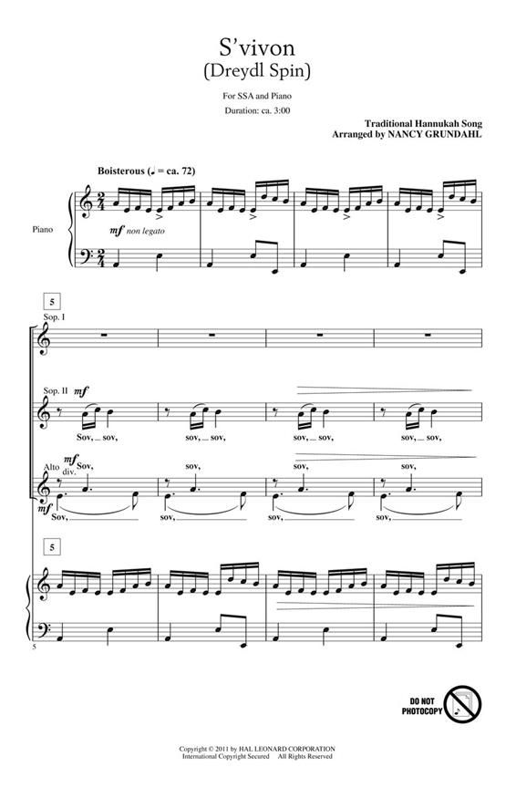 The imagery of the spinning dreydl is colorfully portrayed in the topsy-turvy accompaniment while the vocal lines dance above in lively fashion in this energetic setting of the traditional Hanukkah so...