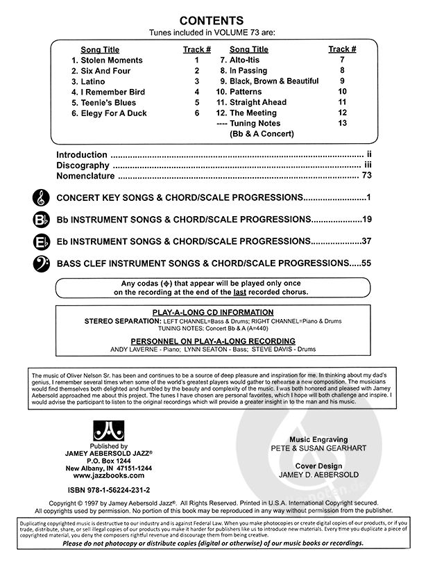 Intermediate. 12 jazz favorites by the world renowned composer, arranger, and saxophone recording artist, Oliver Nelson. Includes one tune by Leonard Feather. A variety of feels and time signatures wi...
