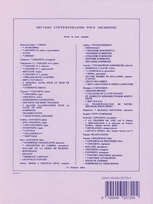 Completed in 1960, Time-Colour by Olivier Messiaen is a famous orchestral piece composed by this author. This edition, published as a book, features the conductor's score with all the following instru...