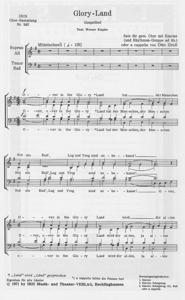 Für 4stg. gemischten Chora cappella oder mit Klavier oder zus. mit Akk., Git., Bass, Schlagzeug bearbeitet von Otto Groll
