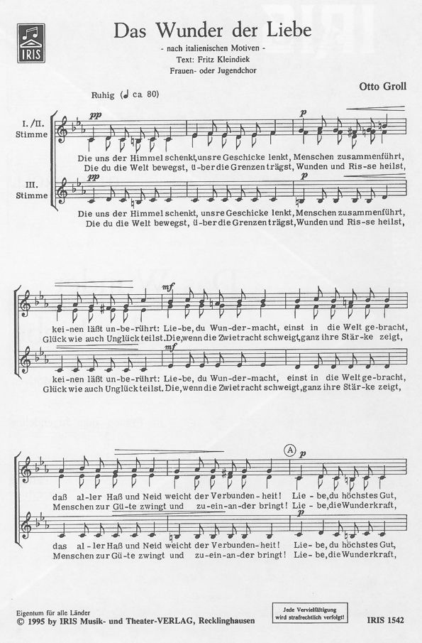 Wie herrlich ist die Welt, wenn die Liebe erwacht aus der Oper 'Die Sizilianische Vesper' für 4stg. gemischten Chor und Klavier oder Gitarre, Bass, Schlagwerk bearbeitet von Otto Groll