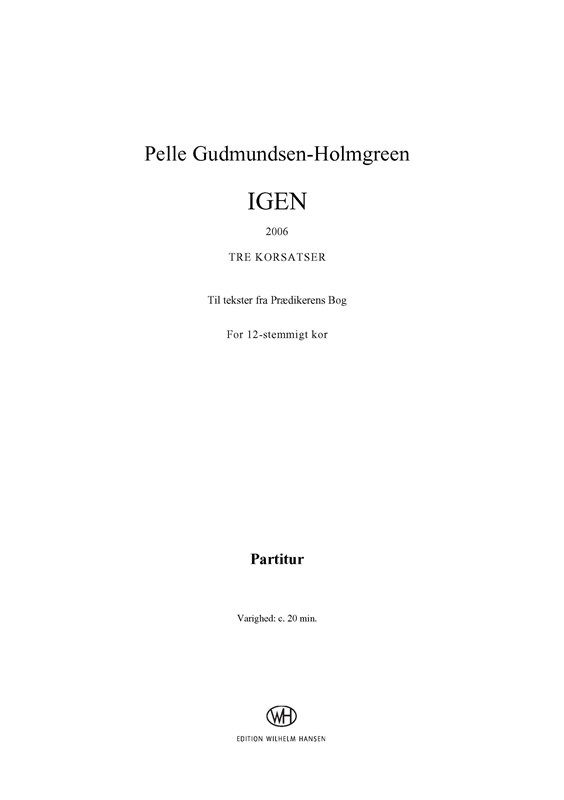 Musik: Gudmundsen-Holmgreen, Pelle og tekst: Book of Prayers. Beskrivelse: Titel: Igen - Tre korsange til tekster fra Praedikerens Bog. Musik: Gudmundsen-Holmgreen, Pelle. Tekst: Book of Prayers. Inst...