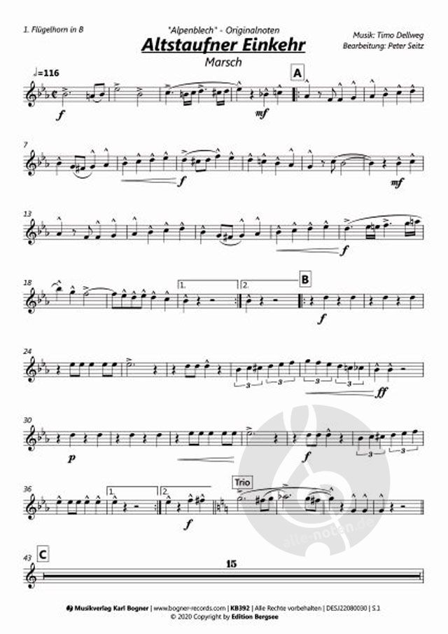 Partitur, 1. Flügelhorn in B, 2. Flügelhorn in B, Trompete in B, Tenorhorn in B, Bariton in C, Bariton in B, Tuba in C, Schlagzeug