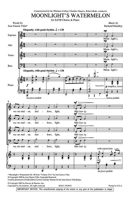 Richard Hundley, der von Sängern wegen seiner eleganten Lieder geschäzt wird, hat eines seiner beliebtesten Lieder für gemischten Chor gesetzt. Das Gedicht von José García Villa spielt mit Variationen...