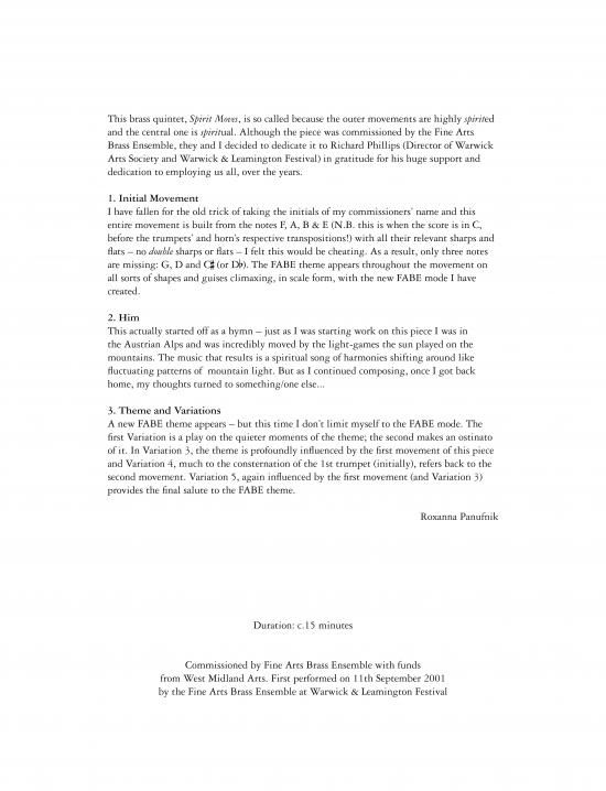 Roxanna Panufniks Spirit Moves für Blechbläserquintett wurde vom Fine Arts Brass Ensemble in Auftrag gegeben. Das 15-minütige Stück ist mit zwei Trompeten in B (1. auch Piccolo-Trompete, 2. auch Flüge...