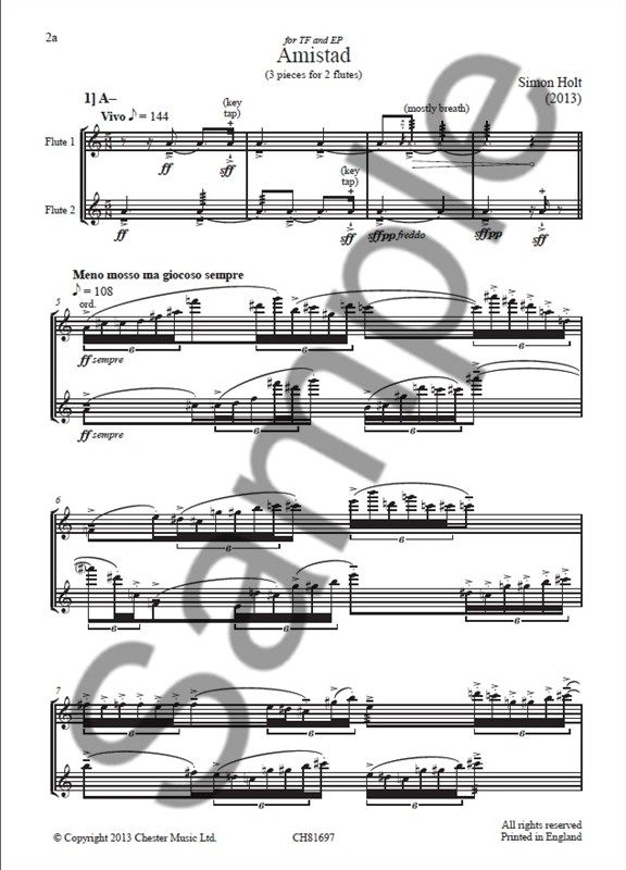 Amistad (the Spanish word for friendship) is a brief set of three pieces for two Flutes composed by Simon Holt in May 2013. It takes its form from the three syllables of the word a-mi-stad. The first...