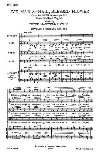 Ave Maria, Hail Blessed Flower (Op. 17) was written in 1961, and premiered at Cirencester Grammar School. It is a simple Christmas carol for unaccompanied SATB choir. It uses the image of the Virgin M...