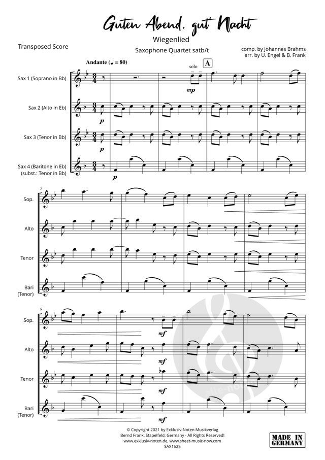 famous 'Good Night-song' by Brahms, arranged for 4 saxes