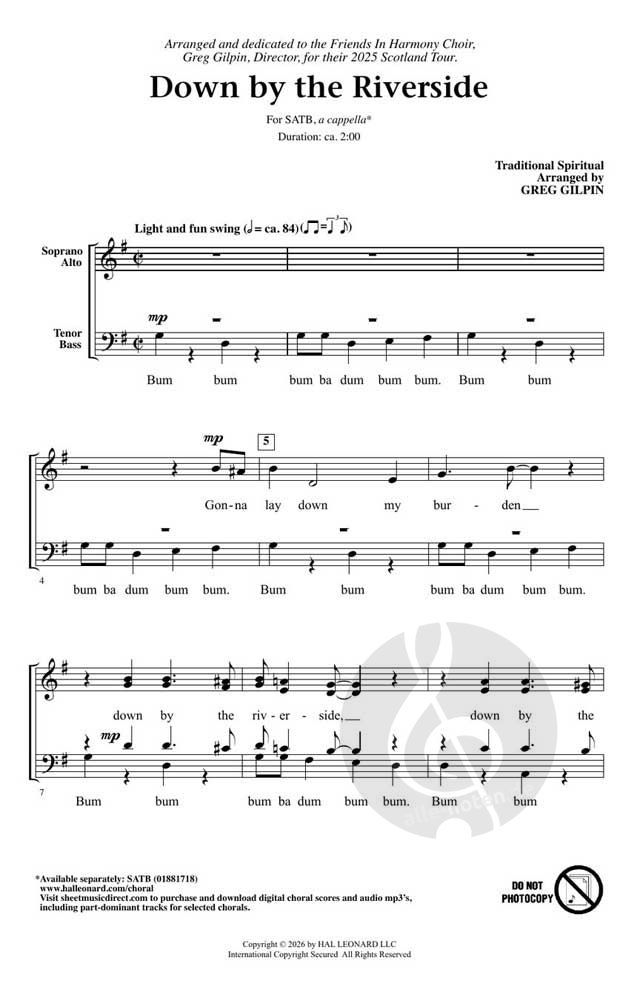 A grandiose choral introduction travels through several keys to open this polished setting of the traditional spiritual, which soon breaks into a joyously brisk treatment featuring call-and-response b...