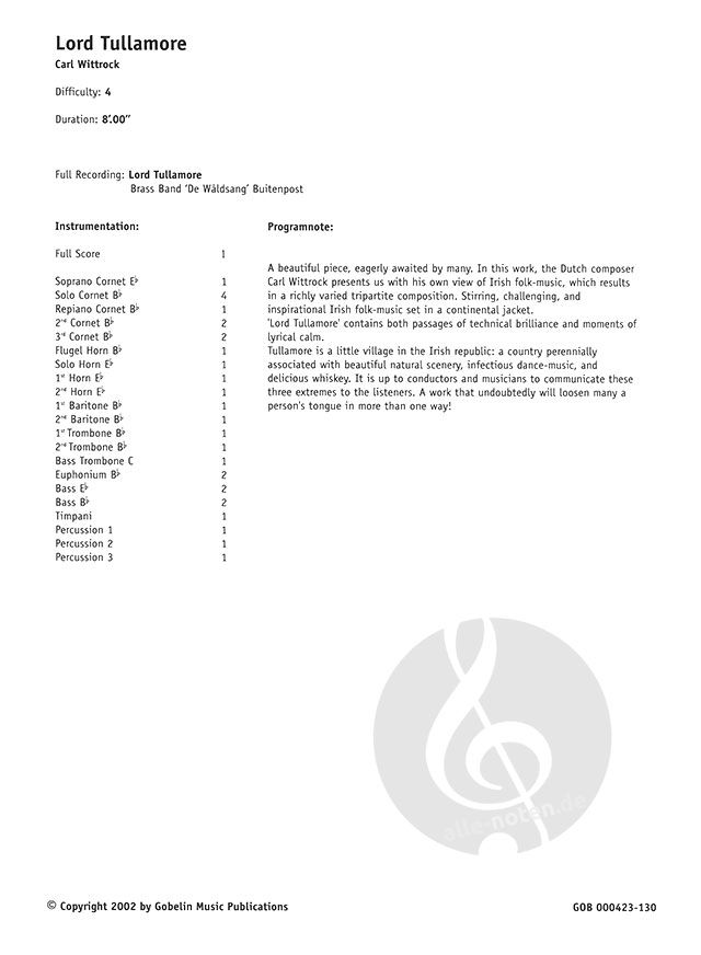 In Lord Tullamore setzte Carl Wittrock seine eigene Vorstellung irischer Volksmusik um. Das Resultat ist eine sehr abwechslungsreiche dreiteilige Komposition, die man als mitreißenden, inspirierenden...