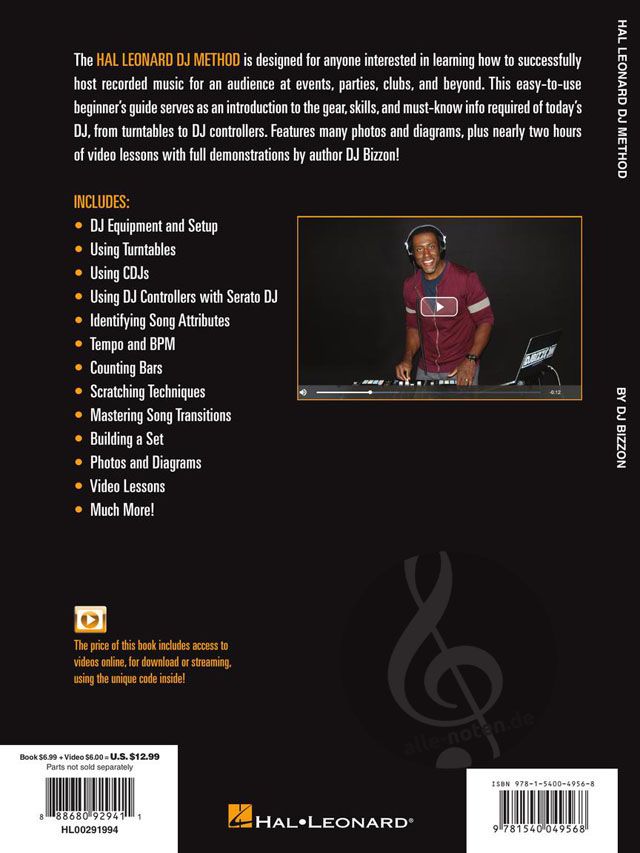 The Hal Leonard DJ Method is designed for anyone interested in learning how to successfully host recorded music for an audience at events, parties, clubs and beyond. This easy-to-use beginner's guide serves as an introduction to the gear, skills and must-know info required of today's DJ. It features many photos and diagrams, plus nearly two hours of video lessons with full demonstrations by author DJ Bizzon! Topics covered include: DJ equipment and setup - using turntables - using CDJs - using DJ controllers with Serato DJ - identifying song attributes - tempo and BPM - counting bars - scratching techniques - mastering song transitions - building a set - and more.