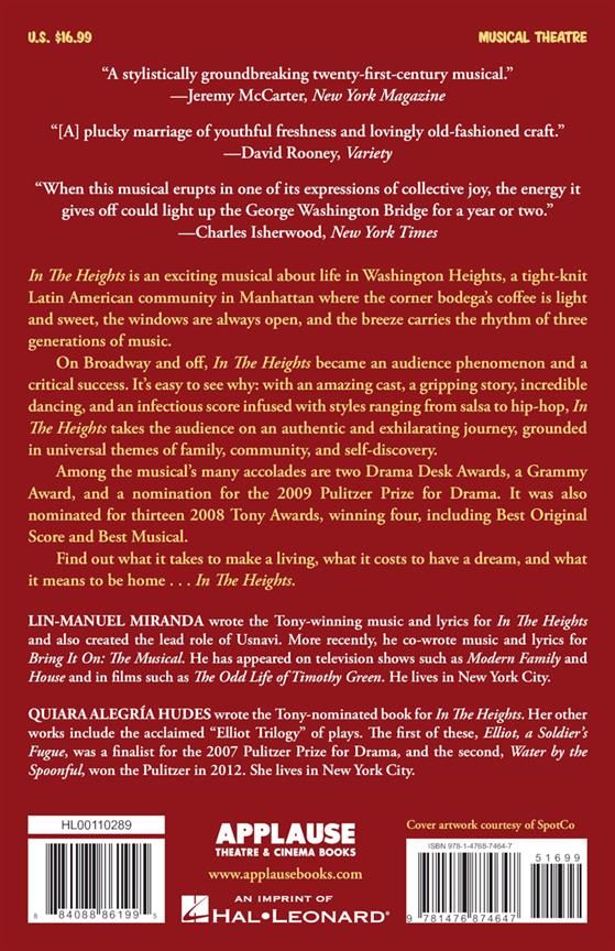 In the Heights is an exciting musical about life in Washington Heights, a tight-knit communitywhere the coffee from the corner bodega is light and sweet, the windows are always open, and the breeze carries the rhythm of three generations of music.