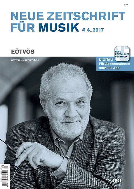 ELEKTRONIKMathias Nofze: Große Tradition an neuem Ort. Das Studio für elektronische Musik des WDR wird ein neues Zuhause findenGESPRÄCHZwischen Himmel und Erde. Peter Eötvös im Gespräch mit Michael KunkelTHEMAEgbert Hiller: Transsilvanien im Traum. Transsilvanische Volksmusik im Schaffen von Peter EötvösSamu Gryllus: Weltuntergang? Halleluja! Zu «Halleluja - Oratorium balbulum» (2015) von Peter Eötvös und Péter EsterházyThomas Meyer. «Ich komponiere aus dem Bauch». Zum Opernschaffen von Peter EötvösAndreas Láng: «Das hast du eigentlich gut gemacht!» Probenarbeit mit Peter Eötvös anhand von «Tri Sestri»Elena Schwarz: Dirigieren als permanente Kommunikation. Dirigierkurse bei Peter EötvösHans-Klaus Jungheinrich: Der glückliche Jongleur. Peter Eötvös und die Balance zwischen Komponieren und DirigierenPORTRÄTDirk Wieschollek: Evil Nigger. Gay Guerrilla. Mad King. Der Composer-Performer Julius Eastman, eine Ausnahmeerscheinung der amerikanischen MusikKLANGKUNSTPatrick Klingenschmitt: Exotic Hardcore Collective Improvisation Discourse? Ein Kollektiv ägyptischer Künstlerinnen auf der Suche nach dem KlangKLANGMOMENTAnna Schürmer: «Weltpolitik lässt Werke reagieren». Karlheinz Stockhausens «HYMNEN» als globaler EntwurfORTE NEUER MUSIKCecilia Balestra und Marco Mazzolini: Nach der Dunklen Zeit. Zur Kulturpolitik in ItalienNEUES WERKGerardo Scheige: Chor der Instrumente. Lisa Streichs neues Orchesterwerk «SEGEL» (2017)ÜBERGÄNGEChristoph Wagner: Kreative Explosion. Vor 50 Jahren erschien das Album «Sgt. Pepper» der Beatles mit Karlheinz Stockhausen auf dem Cover - damals flirtete Pop mit der AvantgardeKLANGMOMENTBastian Zimmermann: Pragmatisch und funktional. Julien Herion erfindet Klänge für Kaffeemaschinen und AufzuchtstationenBUCHJörn Peter Hiekel: Produktive Denkbewegungen. Martin Zencks neue Monografie über Pierre Boulez BERICHTEWiener FestwochenWittener Tage für neue Kammermusik 2017Das «Orientation»-Festival am Staatstheater MainzDas Kopenhagener KLANG-Festival 2017Zur Ausstellung «Bill Viola ? Installationen» in den Hamburger Deichtorhallen«Clash!» - die Frühjahrstagung des Instituts für Neue Musik und Musikerziehung Darmstadt«Tre Volti», ein neues Musiktheater von Annette Schlünz in Schwetzingen«Oresteia» (nach Aischylos) von Iannis Xenakis am Theater BaselNotizenMeldungen vom ZKM KarlsruheRezensionen Tonträger / BücherBilder + TöneUraufführungen