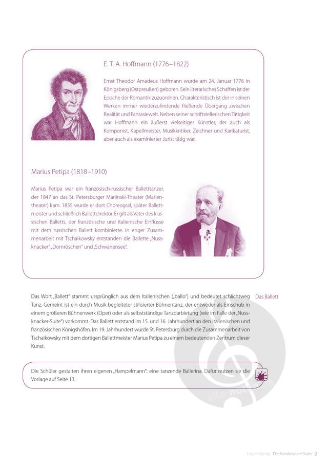 'Die 'Nussknacker-Suite', ein Auszug von Orchesterstücken aus dem gleichnamigen Ballett von Pjotr Iljitsch Tschaikowsky, ist das wahrscheinlich populärste Werk des russischen Komponisten. Der feurig-schnelle 'Trepak', aber auch die märchenhaften Klänge der Celesta im 'Tanz der Zuckerfee' sind bei Filmproduzenten äußerst beliebt und in der Fernsehwerbung omnipräsent. Der Inhalt der einzelnen Stücke sowie ihr Bezug zum Ballett und zur literarischen Märchenvorlage von E. T. A. Hoffmann werden eingehend erläutert. Jedem Satz der Suite sind sowohl erläuternde Lehrerhandreichungen als auch Arbeitsblätter mit fächerübergreifenden Unterrichts- und Lerninhalten gewidmet. Es werden die für die jeweiligen Stücke charakteristischen Instrumente vorgestellt. Hörbeispiele mit zahlreichen musikalischen Vergleichskompositionen (bis hin zu traditioneller arabischer und chinesischer Musik) schaffen ein breites musikalisches Spektrum. Musizier- und Singaufgaben regen die Schüler zu eigener musikalischer Aktivität an.'