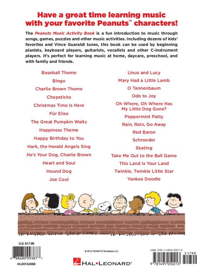 The Peanuts Music Activity Book is a fun introduction to music through songs, games, puzzles and other music activities, including dozens of kids' favorites songs and Vince Guaraldi tunes. This book can be used by beginning pianists, keyboard players, guitarists, vocalists and other C-instrument players. It's perfect for learning music at home, daycare, preschool, and with family and friends.