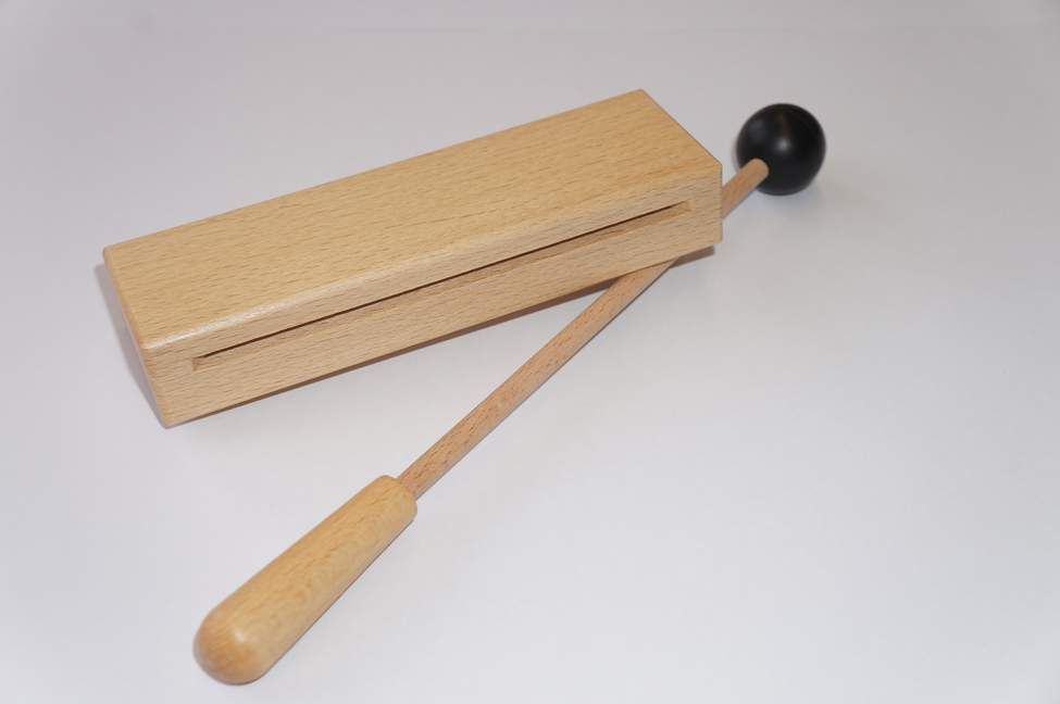 Zwei-Ton-Holzblocktrommel aus Buchenholz, erklingt in den Klangfarben hell und dunklem. Maße: 146 x 44 x 25 mm. Ein Schlägel mit Extra-Griffteil und Gummikopf (medium) für einen angenehmen Klang ist im Lieferumfang enthalten.