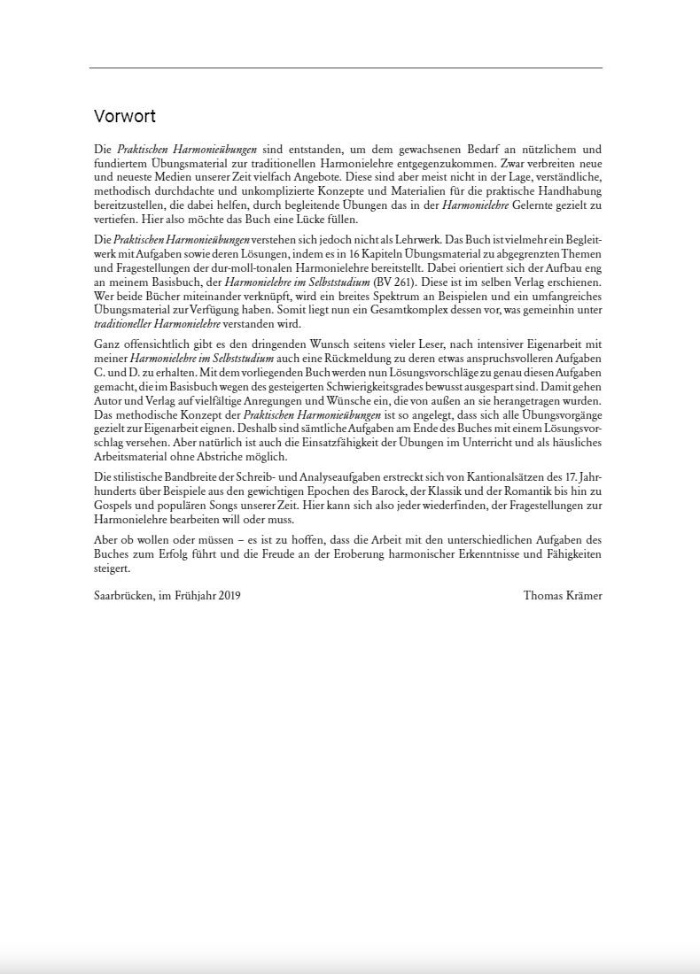 Wer die Praktischen Harmonieübungen begleitend zu Krämers Harmonielehre im Selbststudium verwendet - sei es in Eigenarbeit oder im Unterricht - durchläuft einen methodisch durchdachten Schreib- und Analysekurs, der die Grundzüge der Dur-moll-tonalen Musik von etwa 1600 an bis zur heutigen Zeit umfassend aufbereitet.