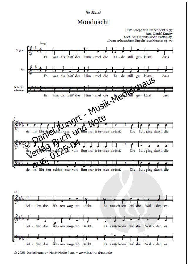 Dies dreistimmige Werk auf das bekannte Gedicht von Joseph von Eichendorff entstand unter Verwendung von Teilen aus Mendelssohns "Denn er hat seinen Engeln befohlen". Ein hübsches Stück Musik, auch fü...