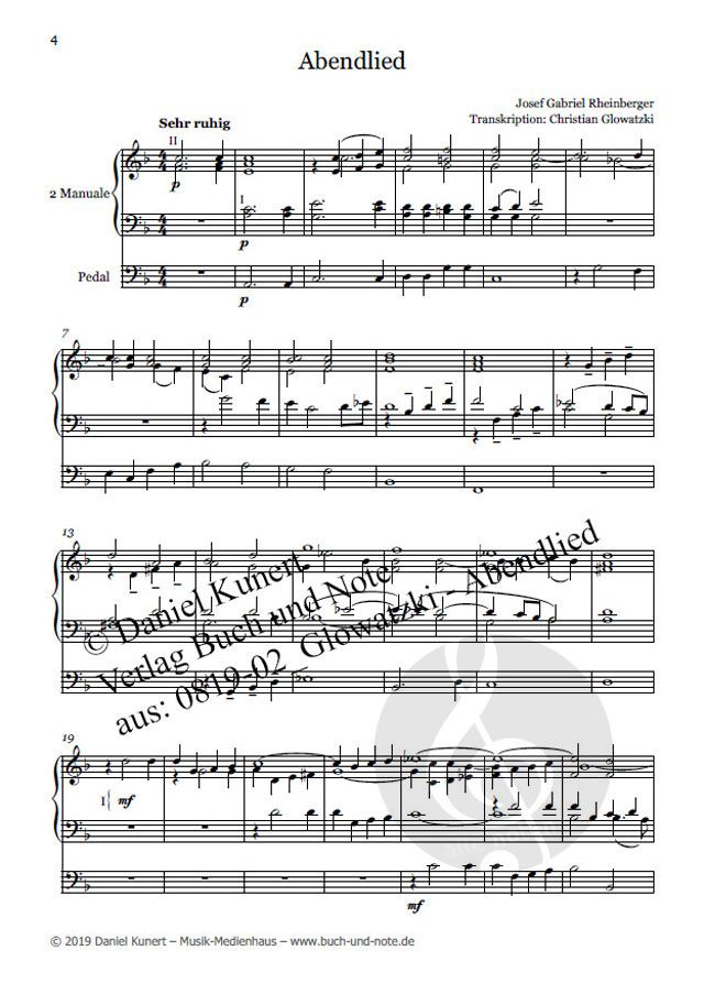 Das bekannte Abendlied von Joseph Gabriel Rheinberger in zwei Bearbeitungen für Orgel solo Geheftete Ausgabe.