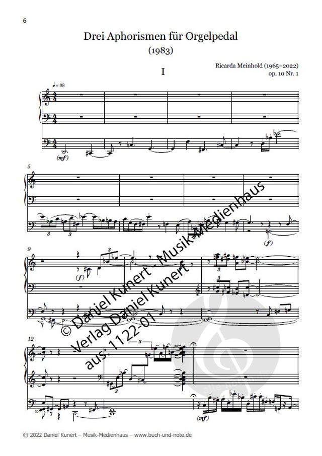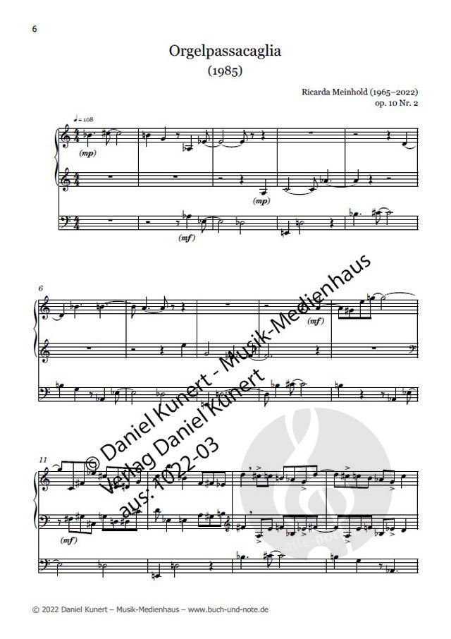Aus dem Vorwort: Der Versuch, drei musikalische formen (Passacaglia - fuge - Choral) in eine sinnvoll gleitende Symbiose einzubinden, bestimmt Ricarda Meinholds (später Hartung) zweite Orgelkompositi...