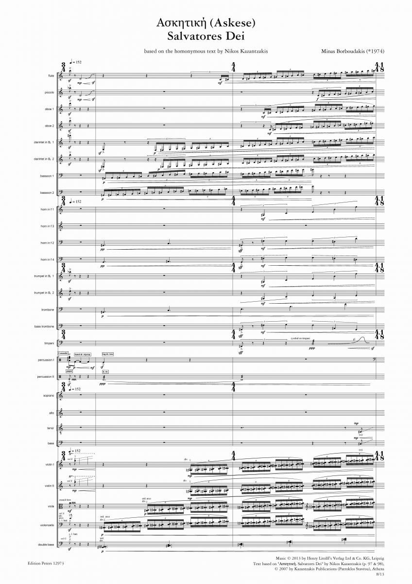 Askese. Salvatores Dei von Minas Borboudakis ist ein 26-minütiges Werk für gemischten Chor und Orchester (2(1/2,Picc,AFl).2(1/2,CorA).2(1/2,BCl).2(1/2,Cbsn) - 4.2(1,PiccTpt/2).2(1/2,BTbn).0 - Timp.2Pe...