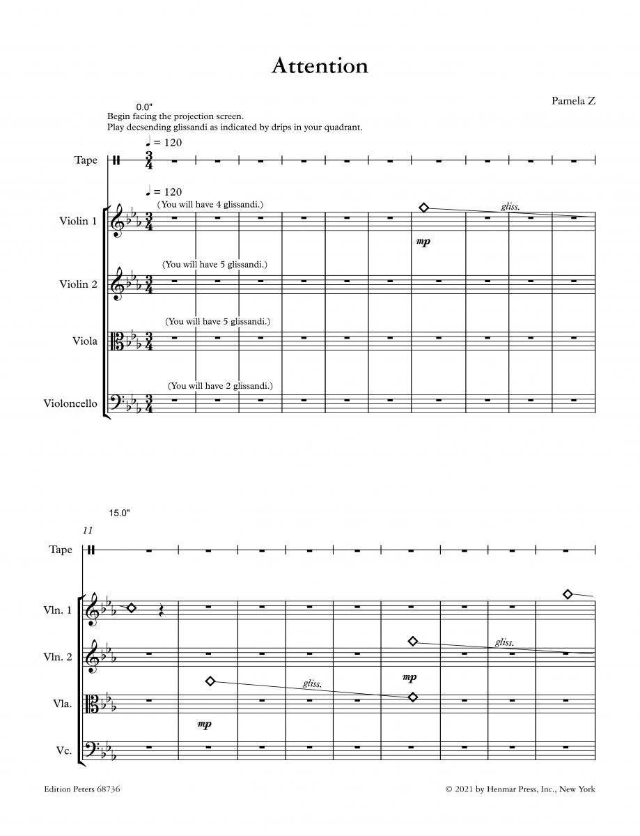 Attention von Pamela Z für Streichquartett, Video, Tonband und Mobiltelefone verbindet multimediale Elemente in einem kammermusikalischen Werk mit einer genialen theatralischen Dimension. Das Werk, da...