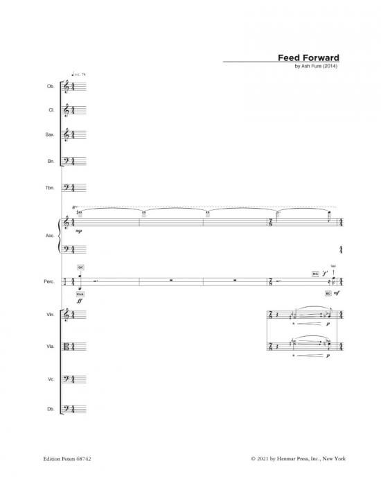 In Feed Forward für großes Ensemble von Ash Fure unterbrechen und unterteilen scharfe Schlagzeugattacken zunächst einzelne Abschnitte des vom restlichen Ensembles gespielten Klangmaterials. Im weitere...