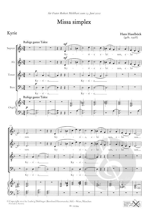 Coro SATB, 2 Ob, 2 Fg, 2 Tr, Timp, 2 Vl, Va, Vc/Cb, Org