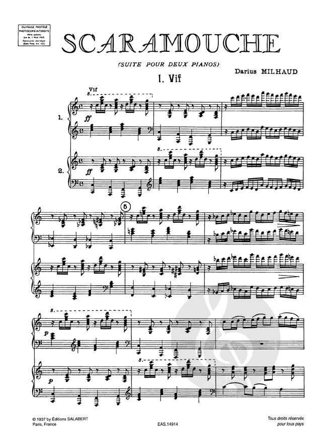 SCARAMOUCHE ist eine Suite in drei Sätzen, die einfache Melodien mit einem drängenden Rhythmus verbindet, der an die brasilianische Musik erinnert, der Milhaud während des ersten Weltkriegs begegnet s...