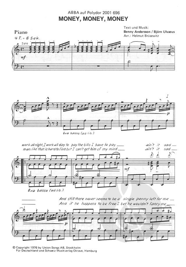 Piano-Direktion, B-Stimme, Eb-Stimme, C-Stimme, Bass, Gitarre und Schlagzeug.
