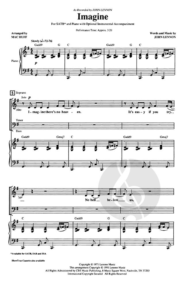 Die emotionale Wirkung des Klassikers von John Lennon ist in der heutigen Zeit hochaktuell. Eine ausdrucksstarke Vertonung. Verfügbar: SATB, SAB, SSA, ShowTrax CD. Aufführungsdauer: ca. 3:20.