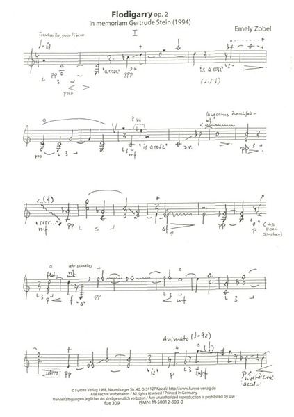 Festgefügte und improvisierende Passagen wechseln einander ab. Mittelschwer. In memoriam Gertrude Stein.