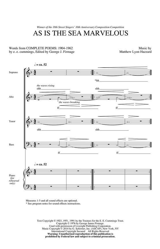 Beginning with a sound-scape where the choir creates the sound of waves and wind, this is a piece for the most adventerous choirs. Once the mood is established, a single tenor voice begins the poem, f...