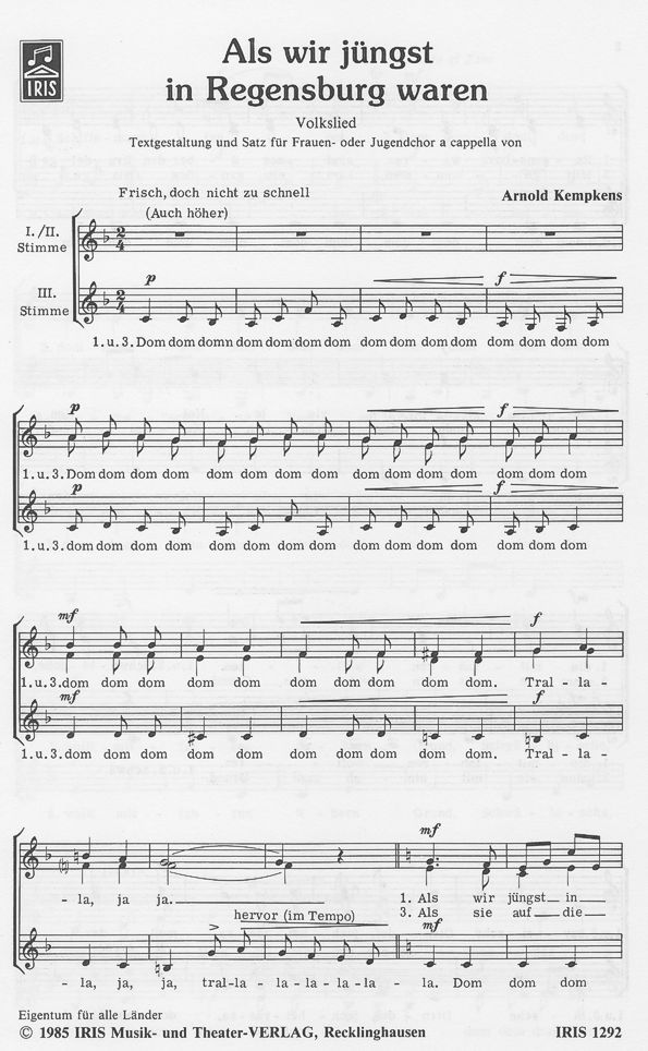 für 3stg. Frauen- oder Jugendchor (Solo oder Trompete ad. lib.) a cappella oder mit Klavier oder zus. mit Akk., Git., Bass, Schlagzeug oder mit Mandolinenorchester (Satz: H. Jakob)
