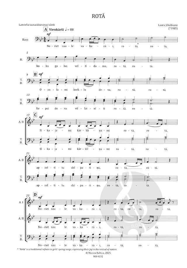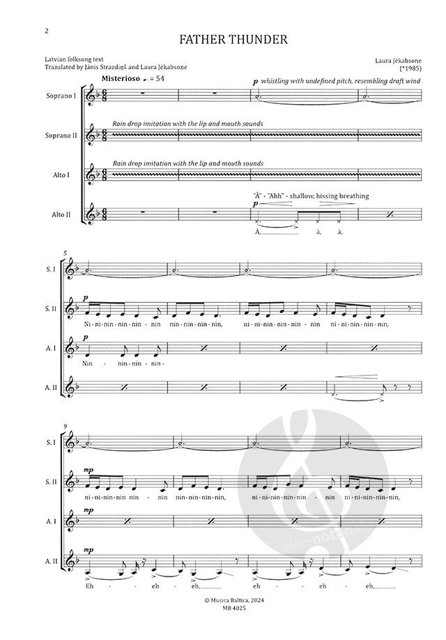 Besetzung: SSAA Father Thunder basiert auf einer Reihe von lettischen Volksliedern und Originalmusik von Laura Jēkabsone. Das Stück wurde ursprünglich für den gemischten Chor "Maska" für den internat...