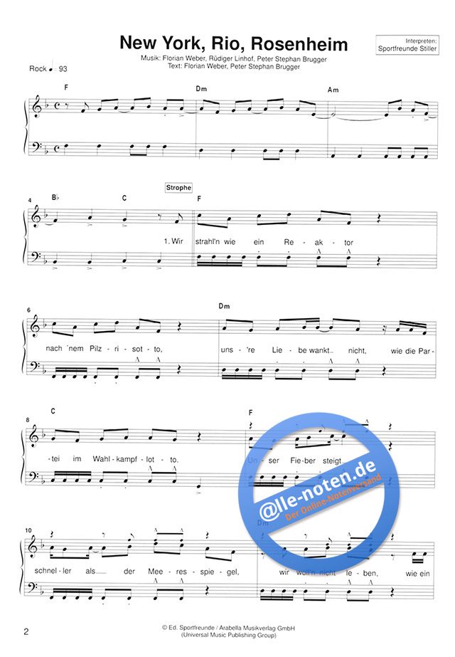 Der Chartstürmer-Titel der Sportfreunde Stiller: New York, Rio, Rosenheim Einzelausgabe für Gesang / Klavier / Akkorde