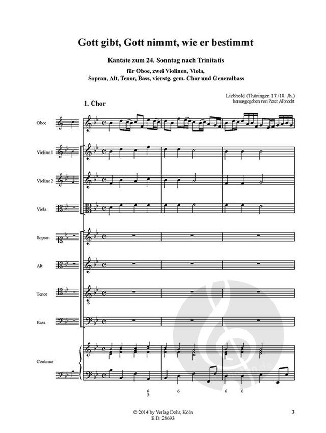 - Soli, Gemischter Chor (4-stimmig), Oboe, 2 Violinen, Viola und Basso Continuo