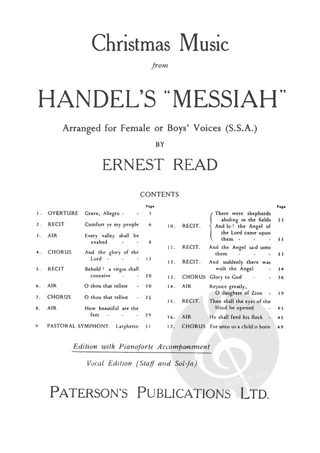 The Christmas from Handel's Messiah arranged for Female or Boy's voices SSA by Ernest Read.