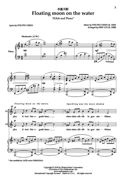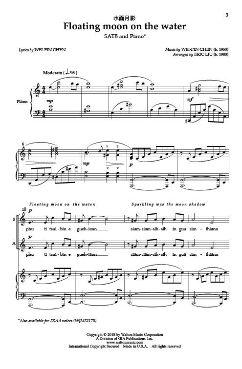 Floating Moon on the Water uses a beautiful text in Taiwanese by Wei-Pin Chen. Using western tonality blended with Taiwanese elements, the melody begins with a touch of sadness and is followed by flow...