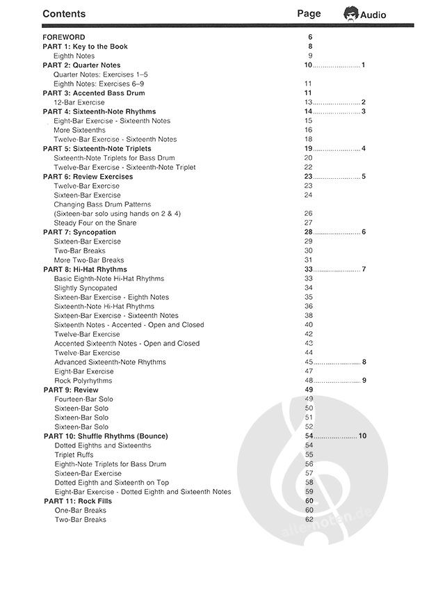 Anwendung erster Notenkenntnisse am Schlagzeug. Erweiterung der Rhythmus- und Notenkenntnisse auf 32tel Noten, Synkopen, Sechstolen, Swing. Viele Übungen am Drumset, Grooves und Fills.