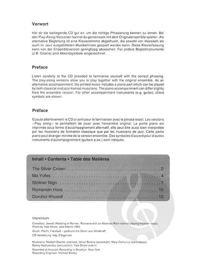 Play Klezmer! richtet sich an Musiker, die den charakteristischen Klang von Klezmermusik entdecken wollen. Die zwölf Stücke sind mit ihren übermässigen Sekunden leicht als jiddische Melodien zu erkenn...