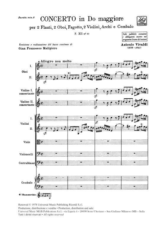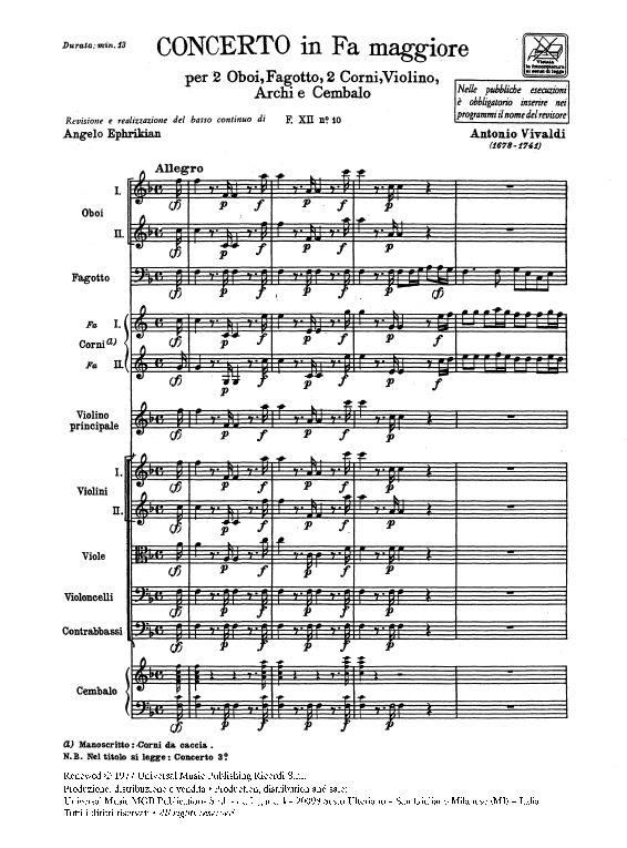 - 2 Oboen, Fagott, 2 Hörner, Violine, Streicher und Cembalo