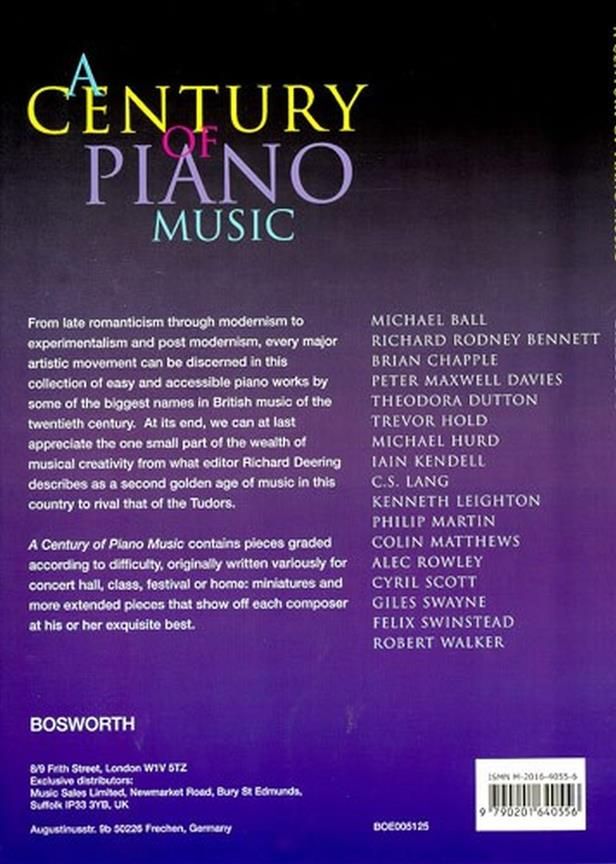 A Century Of Piano Music contains pieces graded accordingly to difficulty, originally written variously for concert hall, class, festival or home: miniatures and more extended pieces that show off eac...