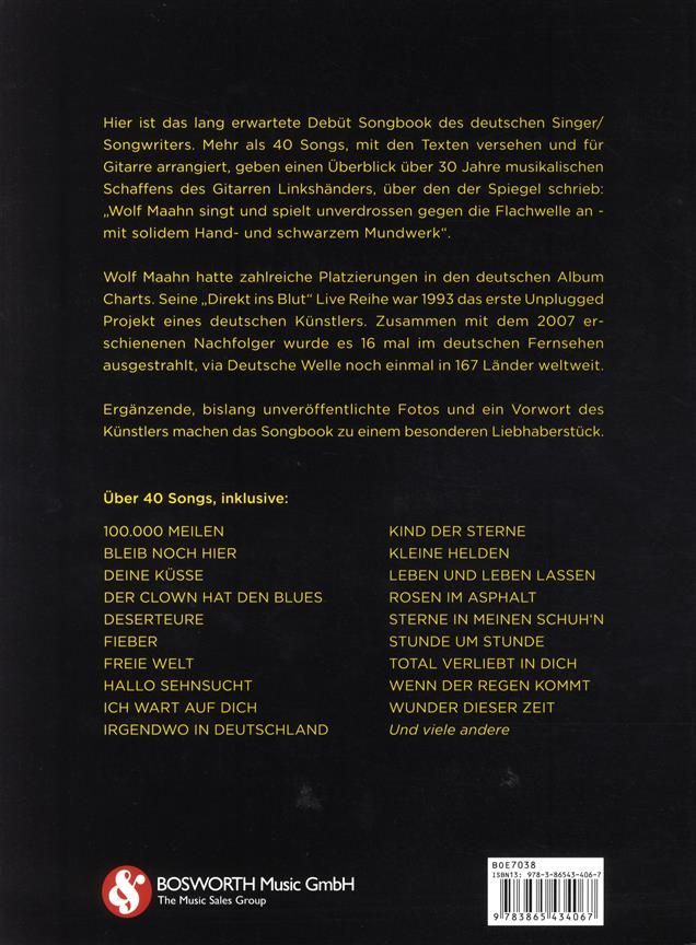 Songbook mit Melodielinie, Texten und Gitarrenakkorden. Mit Fotos. 'Wolf Maahn singt und spielt unverdrossen gegen die Flachwelle an - mit solidem Hand- und schwarzem Mundwerk. ' (Der Spiegel)Ein deut...