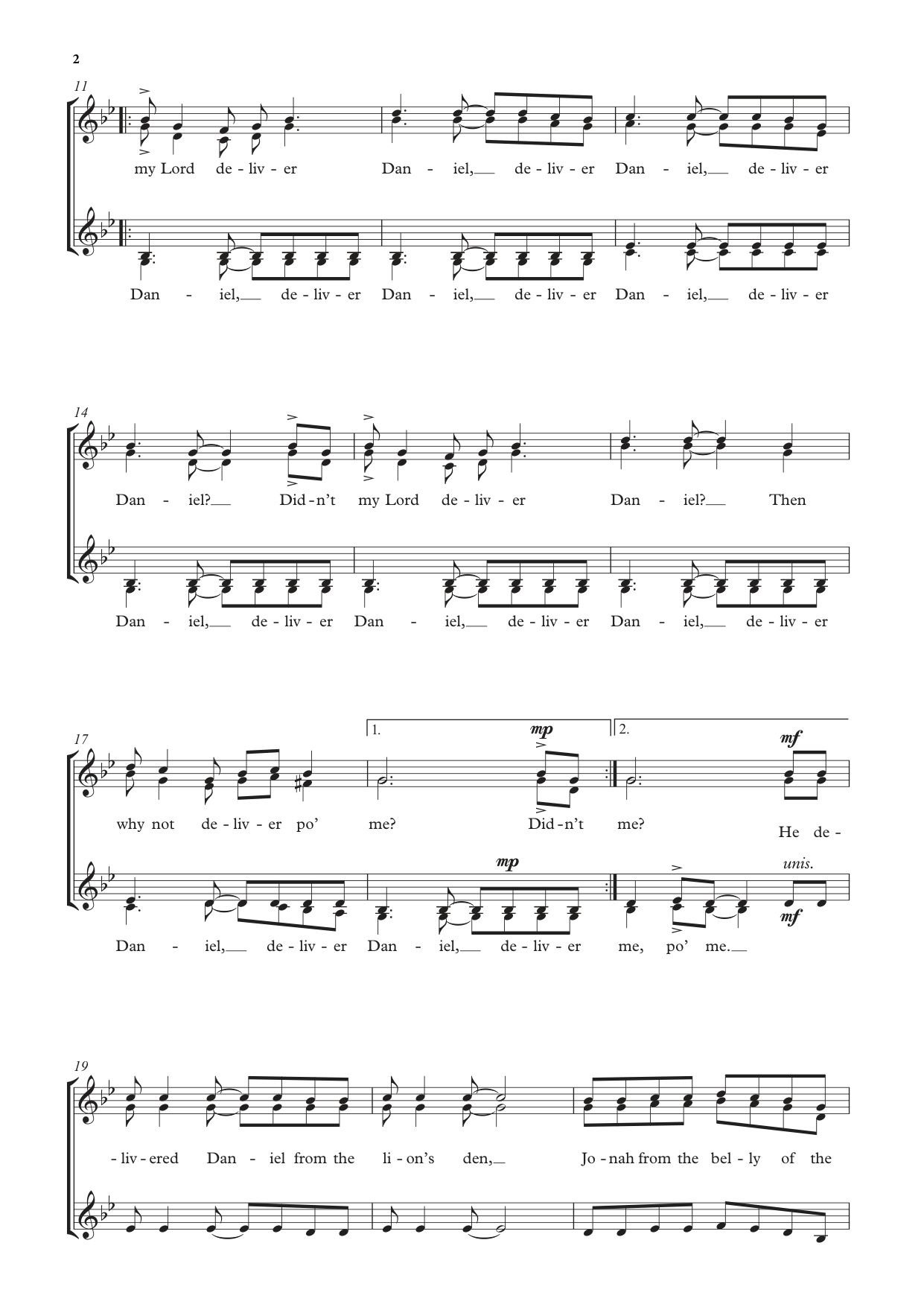 Presented here in a version for unison voices (with optional second part), this piece is characterized by catchy melodies and a syncopated rhythmic drive, including a light-hearted vocal play motif ('...