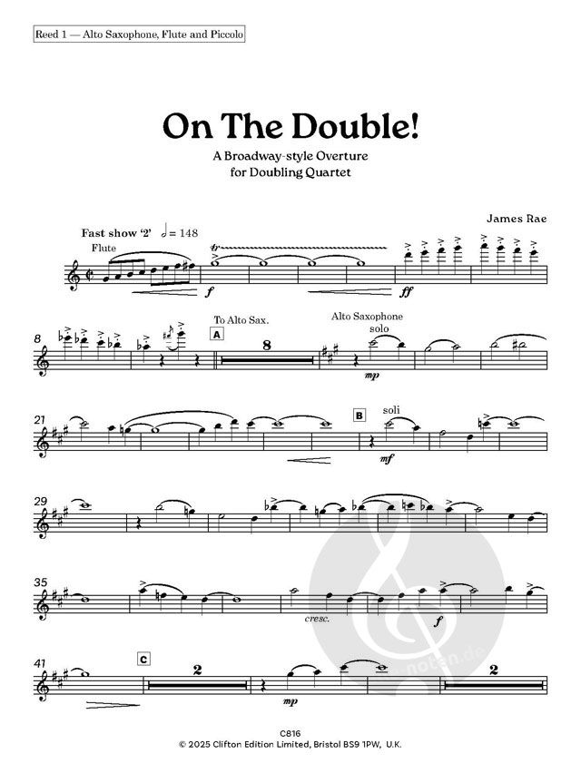 On The Double! wurde von Paul Saunders, einem Lehrer für mehrere Instrumente am Royal Birmingham Conservatoire, in Auftrag gegeben. Jim Raes Antwort war dieses fabelhaft unterhaltsame Werk im Stil ein...